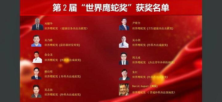 第二届世界鹰蛇奖在深圳再度绽放荣耀,为中国乃至世界医学界振奋了信心,注入了活力。刘耀华、尹绪全、吴乃瞻、吴小剑、俞金龙、周太成、赖佳明、朱红、吴志华、美国David.August等10位世界鹰蛇奖获奖人,各自荣获健康法务杰出贡献奖、卫生健康杰出贡献奖、前沿器材发明奖、外科杰出成就奖、杰出青年外科医师奖、普通外科杰出领袖奖等六个奖项。