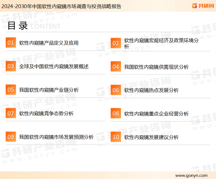 共研产业研究院通过对公开信息分析、业内资深人士和相关企业高管的深度访谈,以及分析师专业性判断和评价撰写了《2025-2031年中国软性内窥镜市场深度调研与市场全景评估报告》。本报告为软性内窥镜企业决策人及投资者提供了重要参考依据。