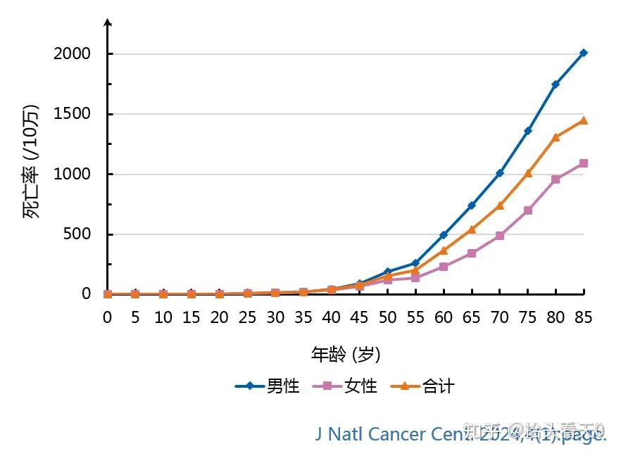 - 全癌种的死亡率在40-44岁年龄组后显著增加,并在85岁及以上年龄组达到峰值 。