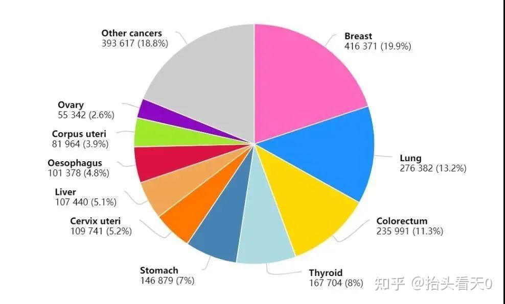2020年中国女性癌症新发病例数前十的癌症分别是:乳腺癌42万,肺癌28万,结直肠癌24万,甲状腺癌17万,胃癌15万,宫颈癌11万,肝癌11万,食管癌10万,子宫内膜癌8万,卵巢癌6万,这十种癌症占女性新发癌症数81%。