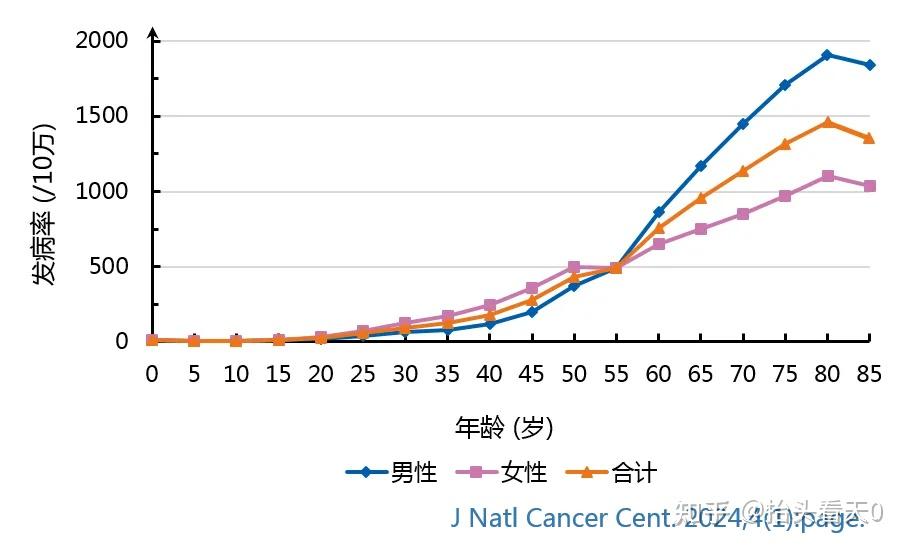 - 全癌种的发病率在0-34岁年龄组相对较低,从35-39岁年龄组开始显著增加,在80-84岁年龄组达到峰值。